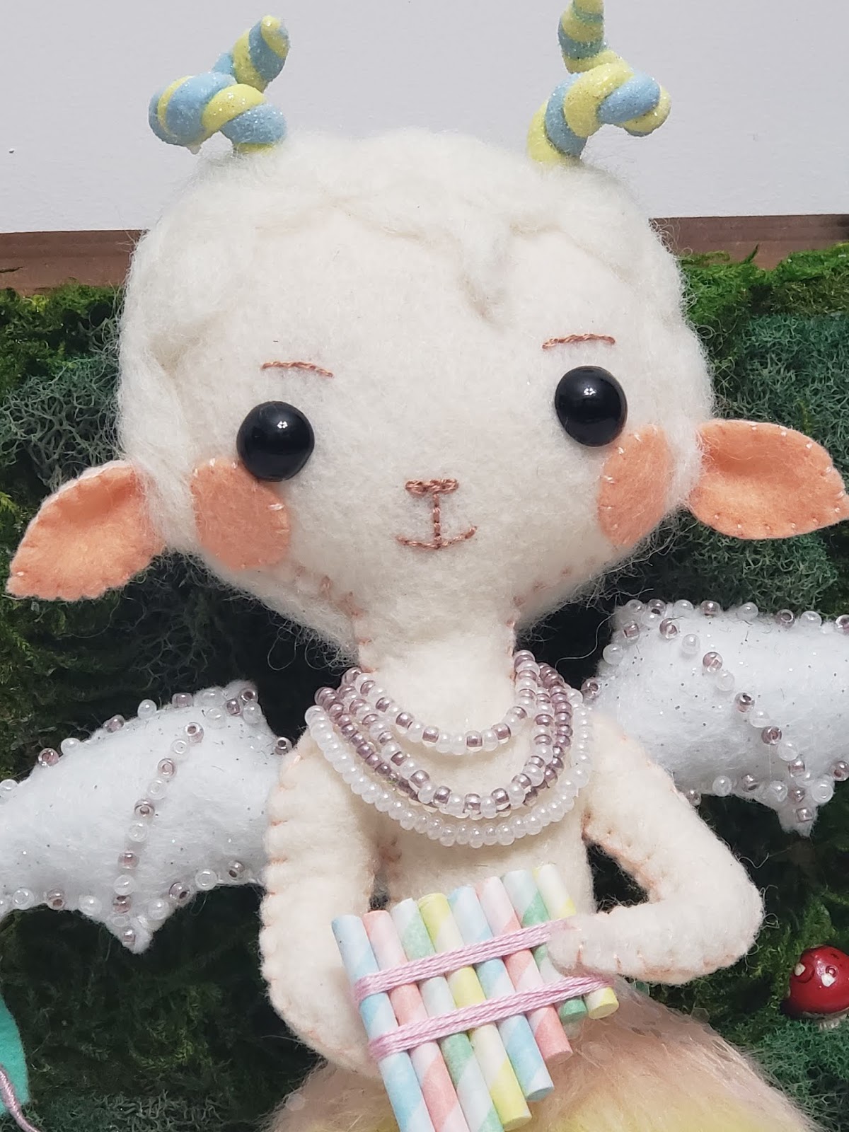 This super fun piece was made out felt and fur, stuffed with polyfill and made his hoofs and horns with clay.